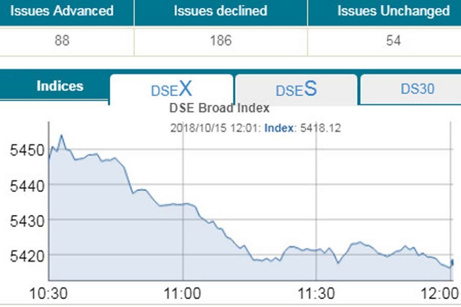 The DSE broad index—DSEX—lost 0.52 per cent or 28.62 points to 5417.78 points after one and half an hour of the session.