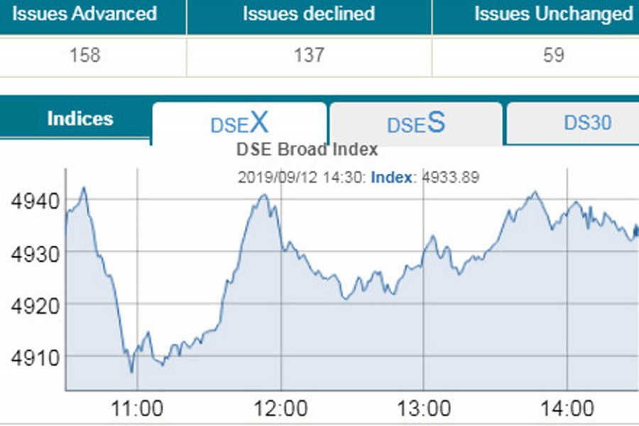 DSEX, the prime index of the Dhaka Stock Exchange (DSE), saw a fractional gain of 0.71 point to settle at 4,933, after losing 100 points in the past two days.