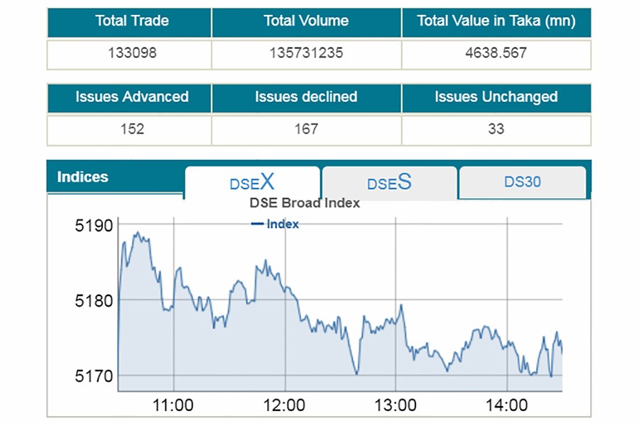 DSEX, the prime index of the Dhaka Stock Exchange (DSE), settled at 5,172, gaining 3.12 points or 0.06 per cent, after gaining 30 points in the previous session.