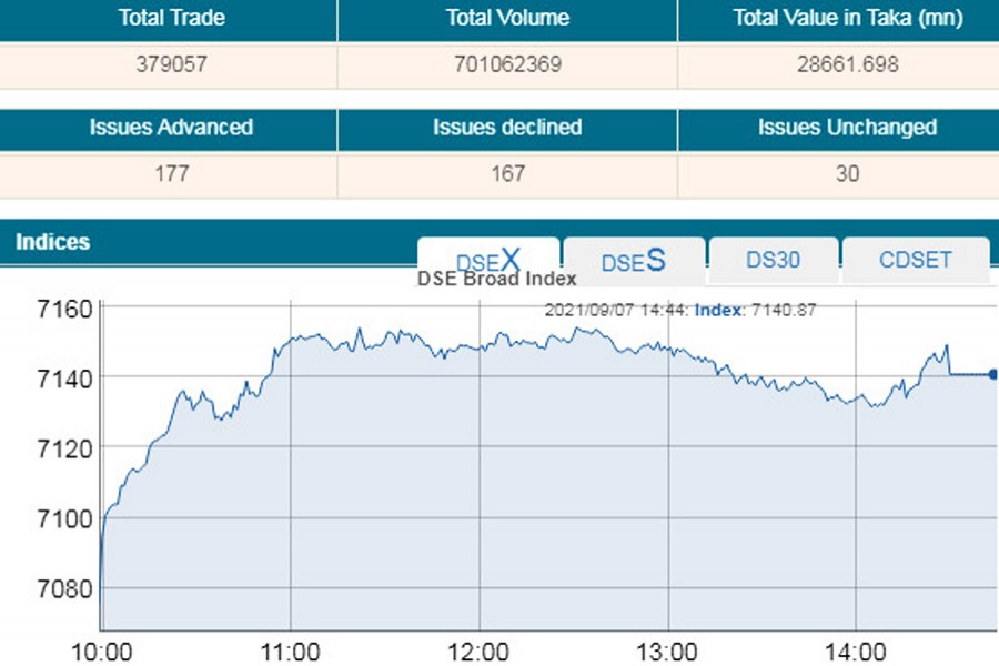 DSEX, the benchmark index of the DSE, went up by 65.38 points or 0.92 per cent to settle at more than 7,140–the highest since its inception nearly nine years back on January 27, 2013.