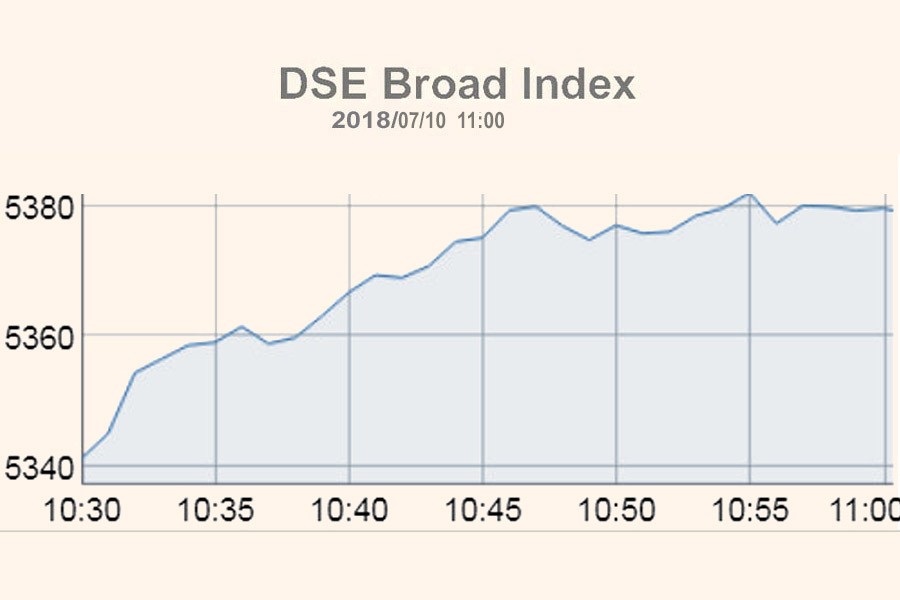 DSEX, the prime index of the DSE, went up by 38.50 points or 0.72 per cent to reach at 5,379 points at 11:00am.