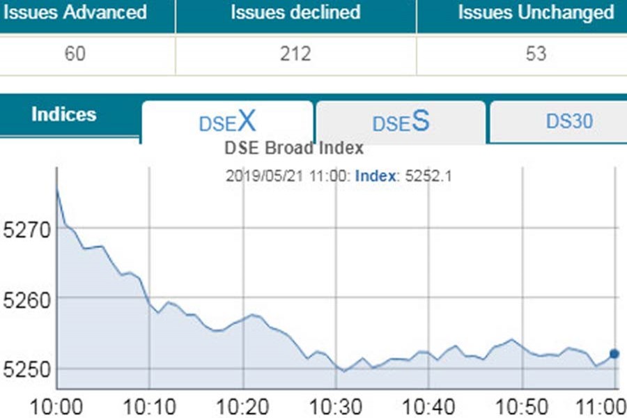 DSEX, the prime index of the DSE, went down by 25.06 points or 0.47 per cent to reach at 5,231 points at 11:00am.