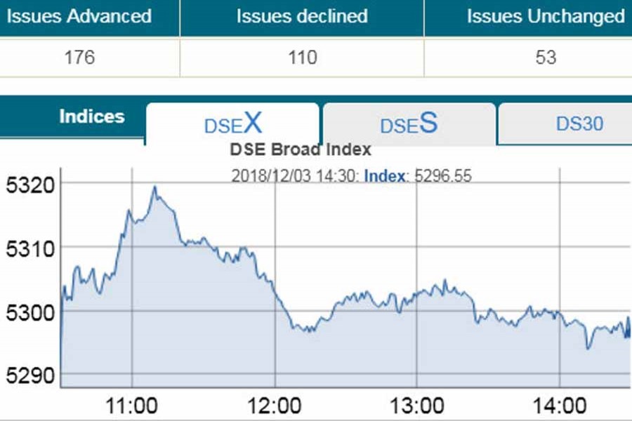 At the end of the session, DSEX, the prime index of the Dhaka Stock Exchange (DSE), settled at 5,296, advancing 5.78 points or 0.11 per cent over the previous day.