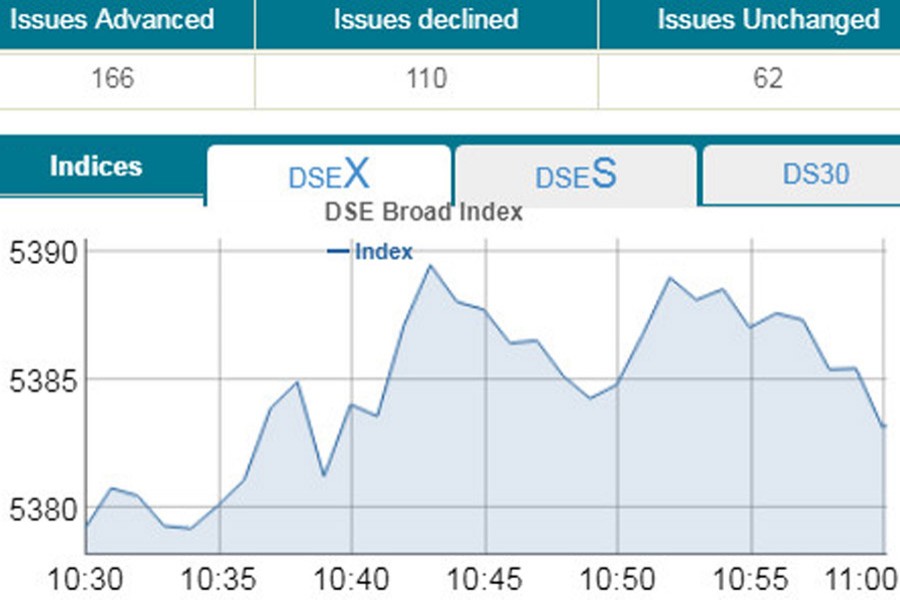 DSEX, the prime index of the DSE, went up by 4.82 points or 0.10 per cent to stand 5,378 points at 11:00am.
