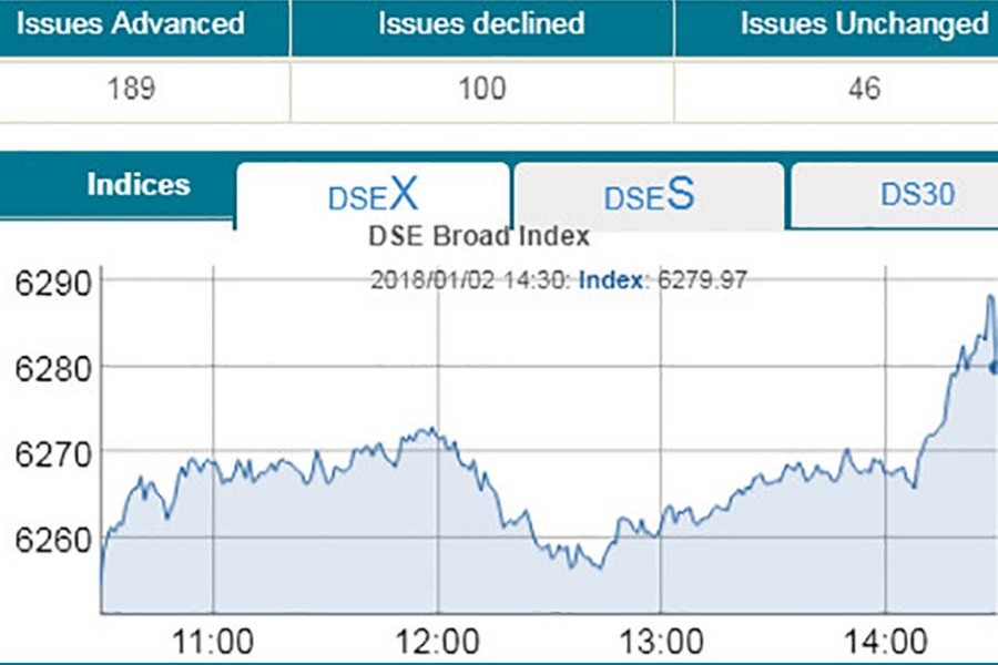 DSEX, the prime index of the Dhaka Stock Exchange (DSE), went up by 25.25 points or 0.41 per cent to settle at 6,280. DSEX added about 95 points in the past five straight sessions.
