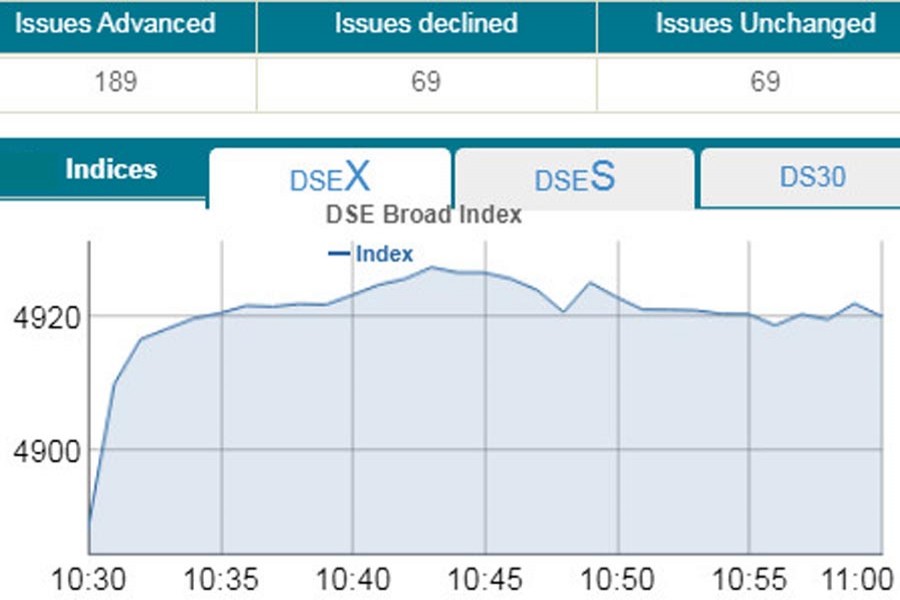 DSEX, the prime index of the DSE, went up by 34.30 points or 0.69 per cent to stand at 4,922 points at 11:00am.