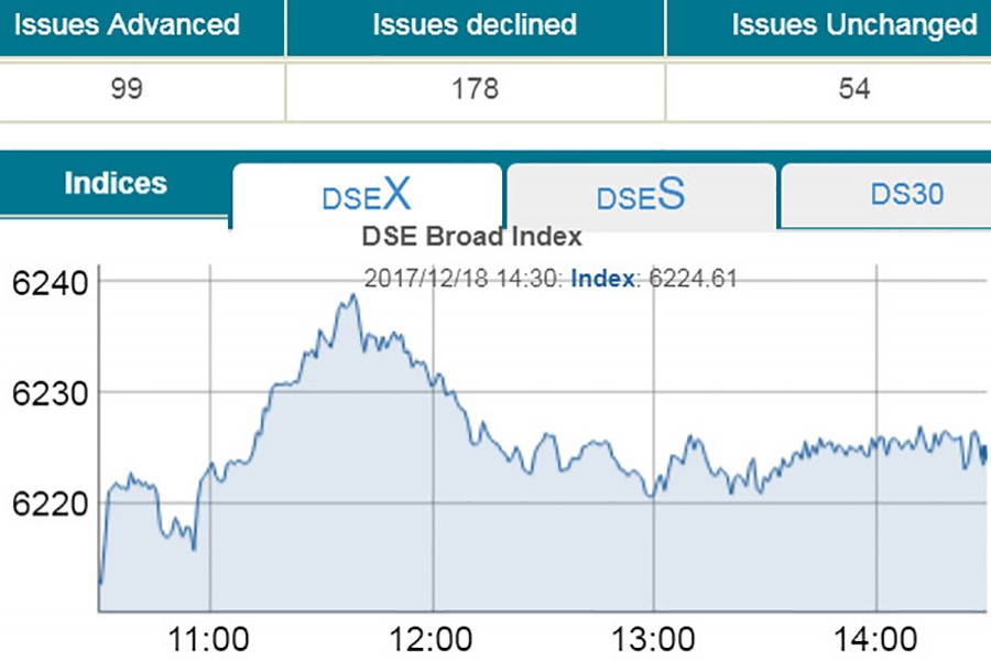 DSEX, the prime index of the Dhaka Stock Exchange (DSE), settled at 6,225, advancing 11.52 points or 0.18 per cent over the previous session.