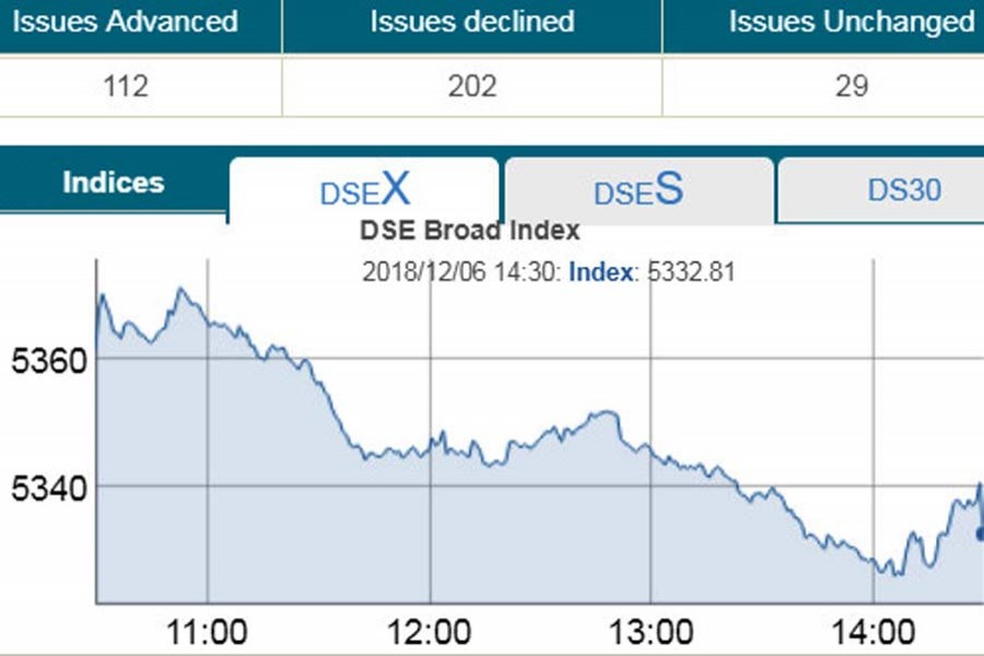 At the end of the session, DSEX, the prime index of the Dhaka Stock Exchange (DSE), settled at 5,332, losing 28.30 points or 0.52 per cent after adding 80 points in the four straight sessions.