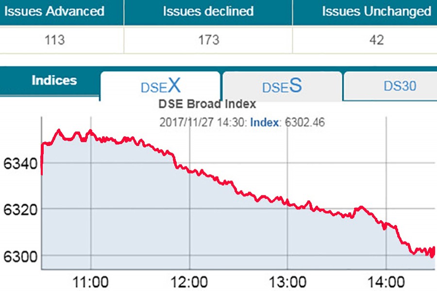 DSEX, the benchmark index of the Dhaka Stock Exchange (DSE) went down by 34.43 points or 0.54 per cent to settle at 6,302, after hitting record high in the previous day.