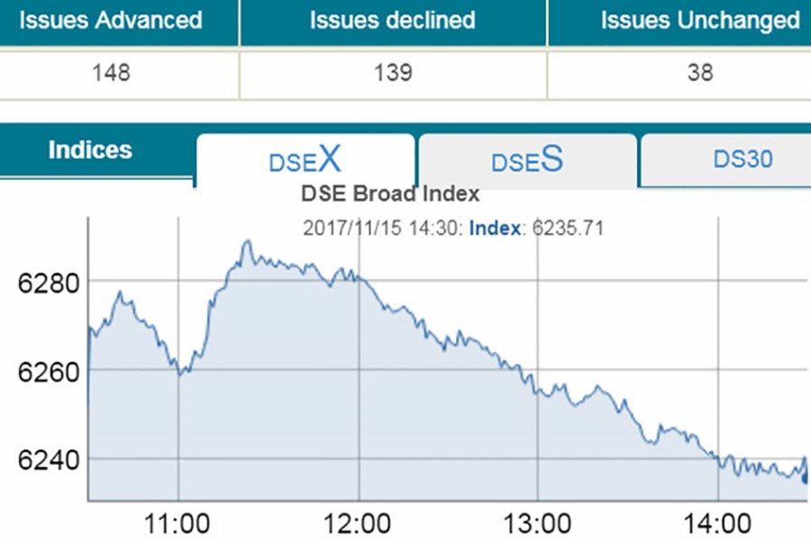 DSEX, the prime index of the DSE, which replaced the DGEN in nearly five years back, went down by 16.43 points or 0.26 per cent to settle at 6,236.
