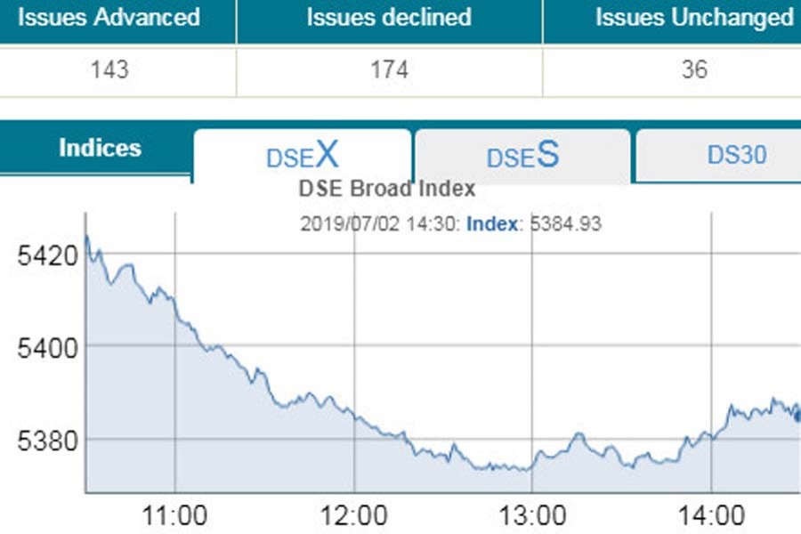 At the end of the session, DSEX, the prime index of the Dhaka Stock Exchange (DSE), went down by 36.69 points or 0.67 per cent to finish below 5,400-mark at 5,384.