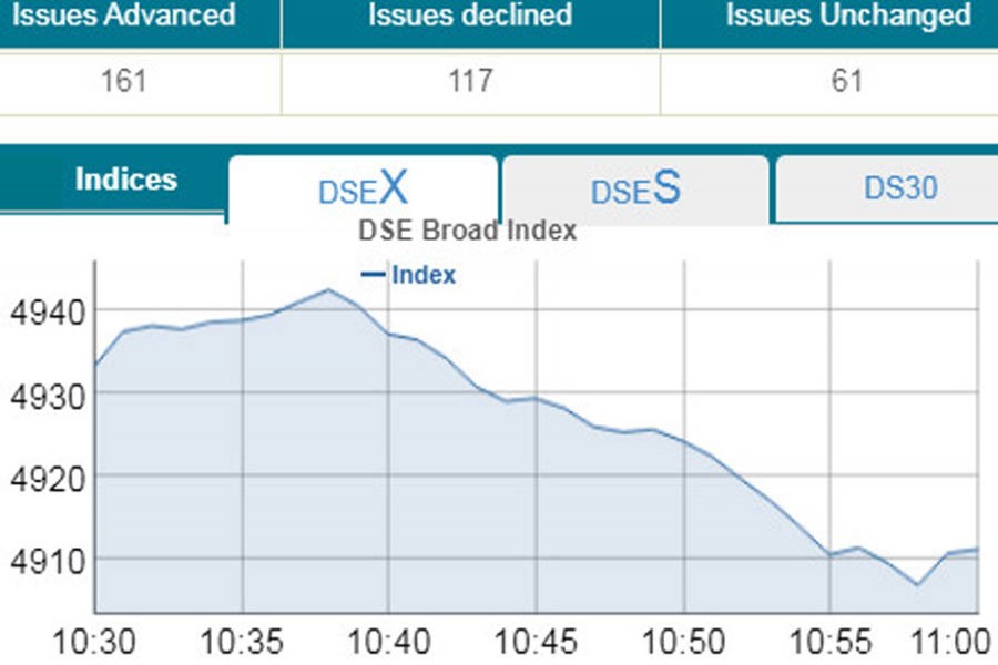 DSEX, the prime index of the DSE, went down by 19.72 points or 0.39 per cent to stand at 4,913 points at 11:00am.