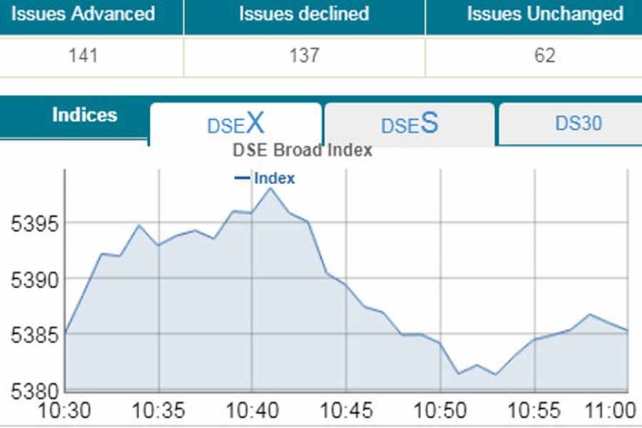 DSEX, the prime index of the DSE, went down by 0.34 point to stand 5,384 points at 11:00am.