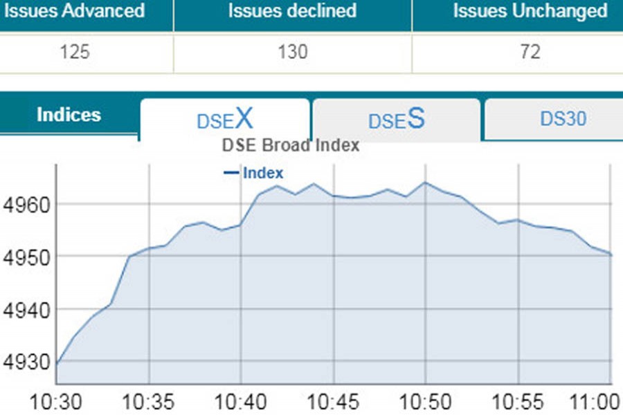 DSEX, the prime index of the DSE, went up by 5.10 points or 0.10 per cent to stand at 4,934 points at 11:00am.