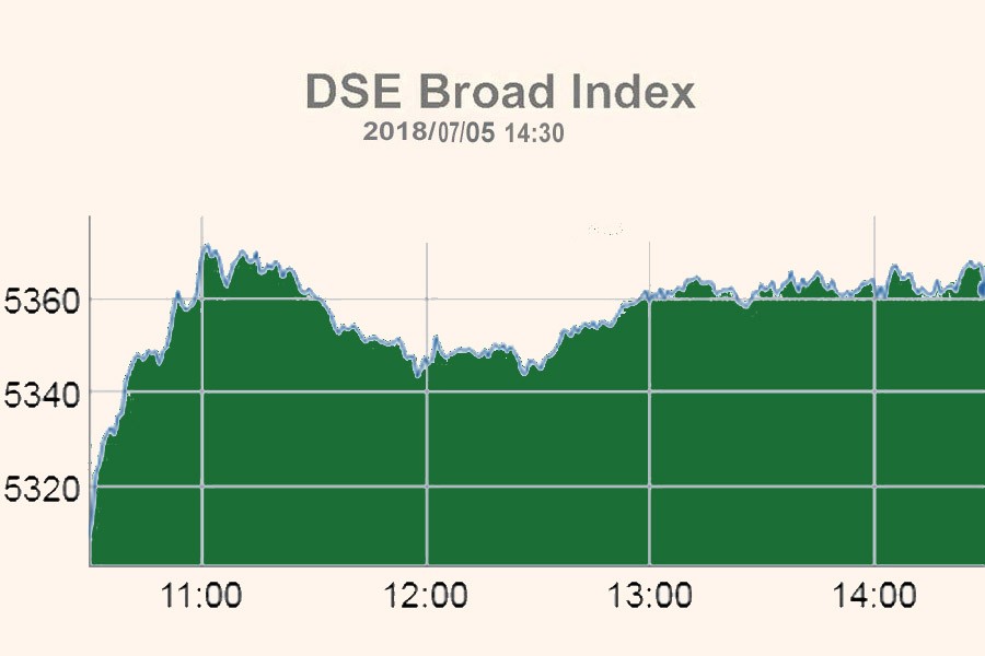 At the end of the session, DSEX, the prime index of the Dhaka Stock Exchange (DSE), went up by 53.16 points or 1.0 per cent to settle at 5,362.