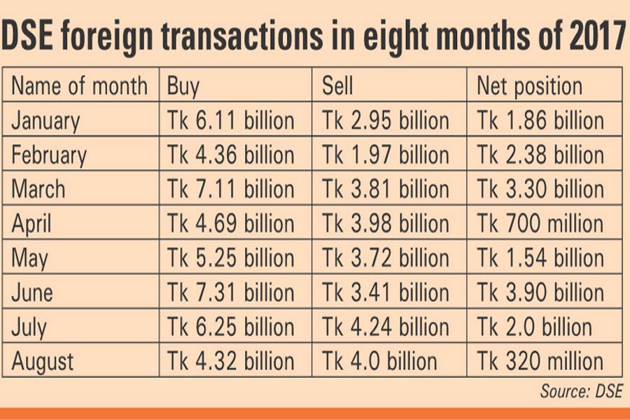 Between January and August 2016, foreign investors bought shares worth Tk 30.51 billon and sold stocks worth Tk 26.05 billion, leaving the net investment at Tk 4.45 billion, the DSE data shows.