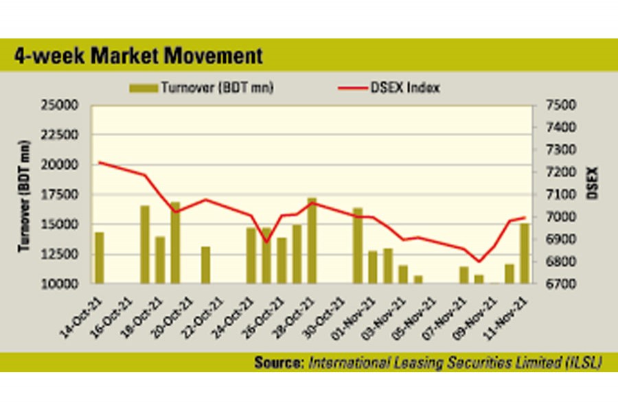 Week on week, the benchmark DSEX index of the Dhaka Stock Exchange (DSE), jumped 89.21 points or 1.29 per cent to settle the week at 6,996, after erasing 384 points in the past four consecutive weeks.
