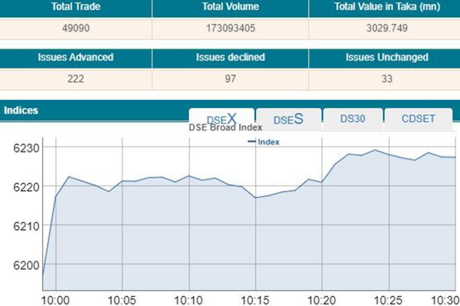 Following the previous day’s marginal correction, DSEX, the prime index of the DSE, went up by 31.68 points or 0.51 per cent to reach at 6,228 within the first 30 minutes of trading when the report was filed at 10:30 am.