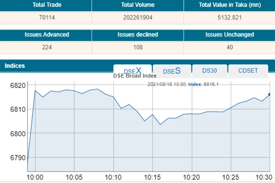 Turnover, another important indicator of the market, stood at Tk 3.36 billion within the first 30 minutes of trading at 10:30 am.