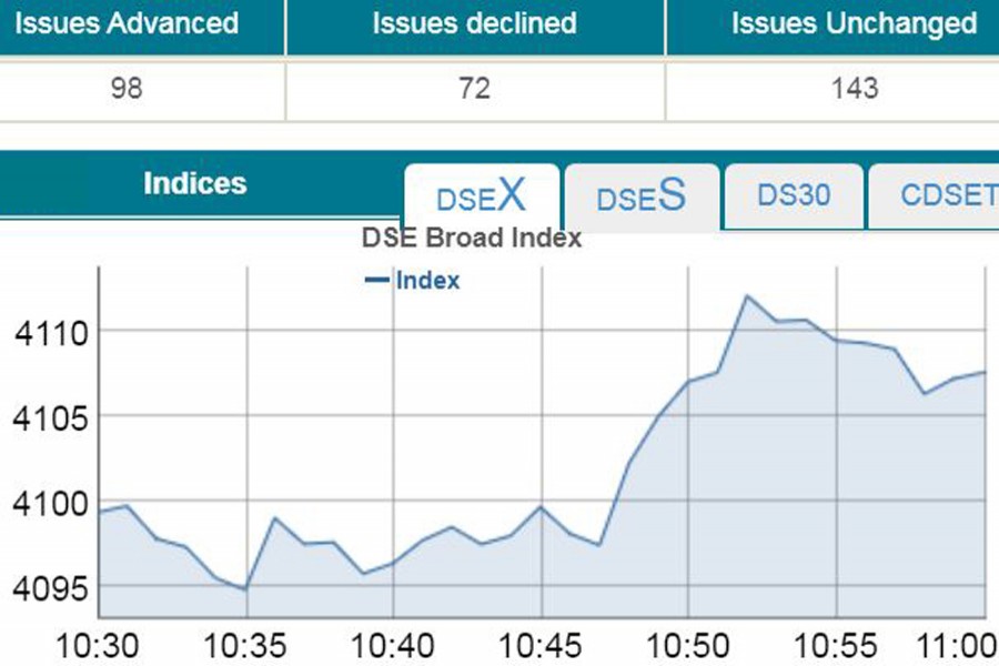 DSEX, the prime index of the DSE, went up by 8.25 points or 0.20 per cent to stand 4,107 points at 11:00 am.