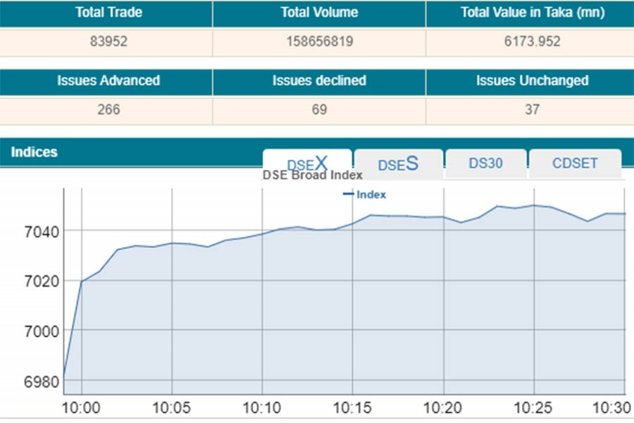 DSEX, the prime index of the Dhaka Stock Exchange (DSE), went up by 71.44 points or 1.02 per cent to stand at 7,052 points within the first 30 minutes of trading at 10:30 am –the highest since its inception on January 27, 2013.