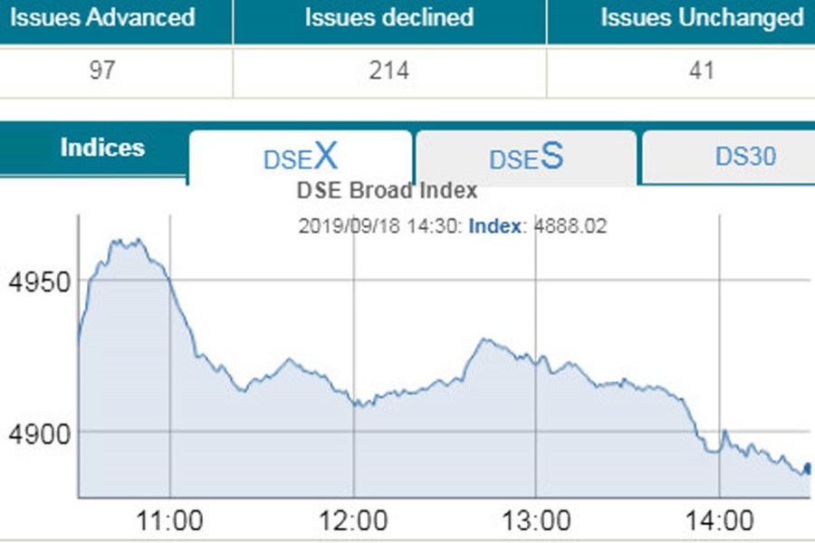 DSEX, the prime index of the DSE, eroded 40.96 points or 0.83 per cent to settle at more than 33-months low at 4,888. On December 12, 2016, the index was 4,869.