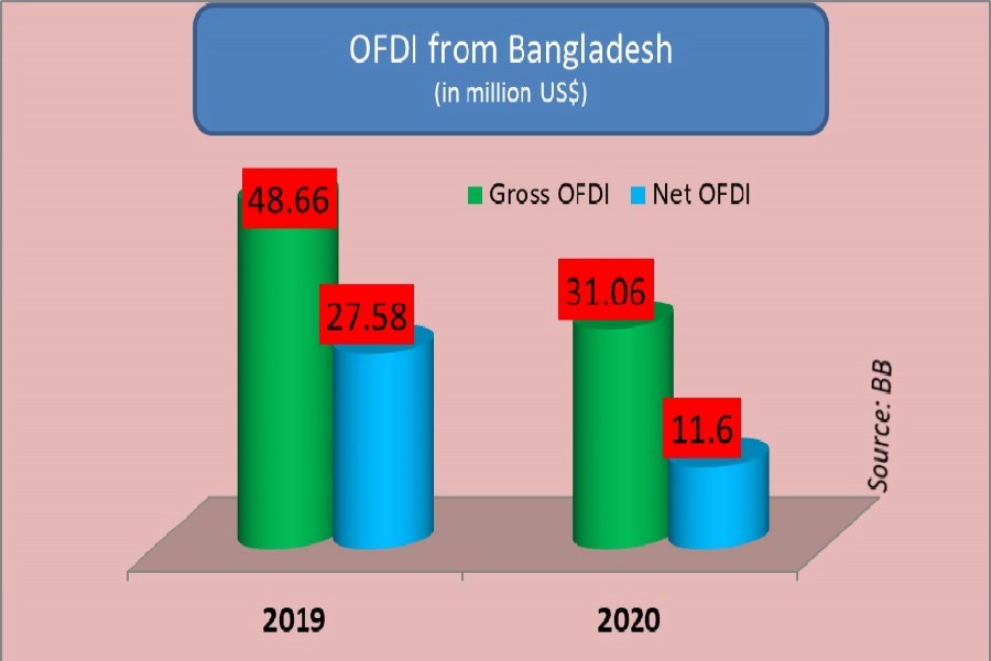 Statistics available with Bangladesh Bank showed that net outflow of foreign direct investment (OFDI) was at US$ 11.60 million in 2020, down by 57.90 per cent over the previous year. In 2019, net OFDI stood at $27.58 million.