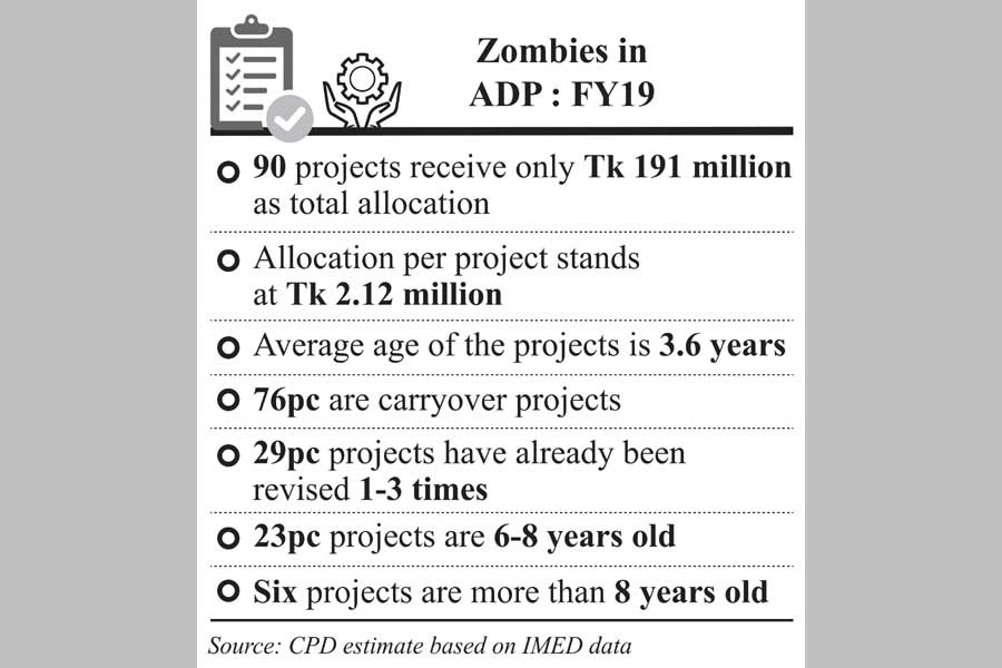 The public investment programme namely the Annual Development Programme (ADP) constitutes more than 95 per cent of development budget of Bangladesh. ADP projects are undertaken with an objective to facilitate private investment, promote economic growth, create employment opportunities and alleviate poverty. But if the desired results or benefits from a project cannot be realised in proper time, then it becomes ineffective, causes waste of scarce public resources and turns into a burden for the government. When a development project simply consumes resources and carries on for so long that it seems to be neither alive nor dead, it is called a 'zombie' project.