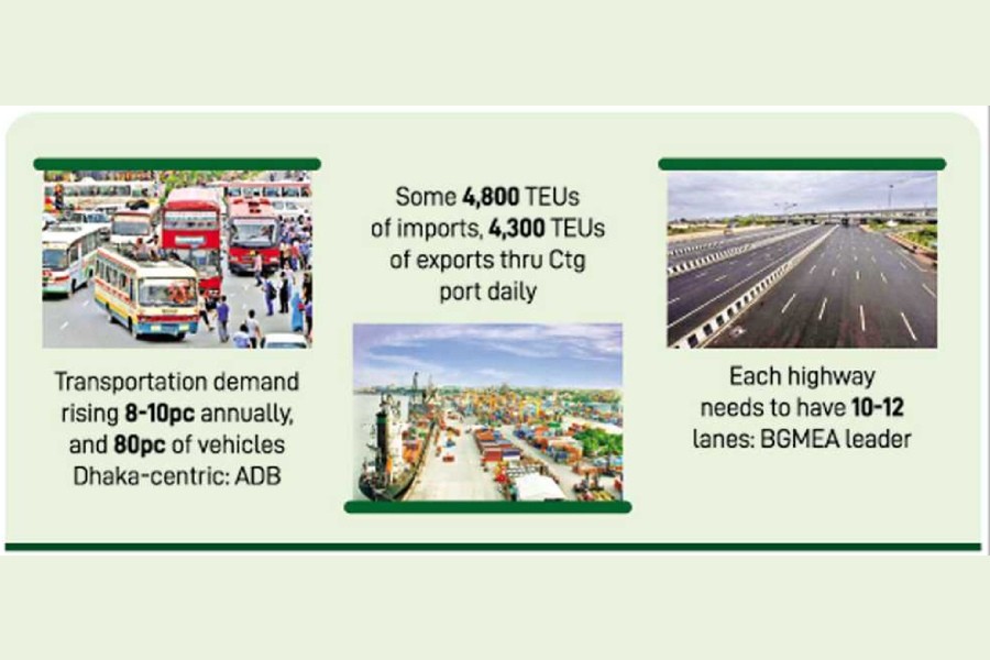 Bangladesh Garment Manufacturers and Exporters Association (BGMEA) first vice-president Syed Nazrul Islam Chowdhury feels that heavy weight-loading capacity with 10 to 12 lanes is required on the Dhaka-Chittagong highway to materialise government bid to boost industrialisation.