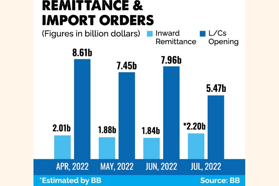The opening of letters of credit (LC), generally known as import orders, dropped over 31 per cent to $5.47 billion in July 2022 from $7.96 billion a month before, according to Bangladesh Bank (BB)'s latest statistics.