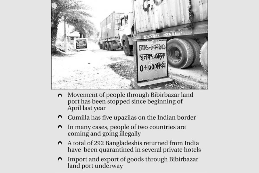 CUMILLA: Cumilla district covers at least 106 kilometres of Bangladesh-India border areas. There is also a land port in Cumilla.