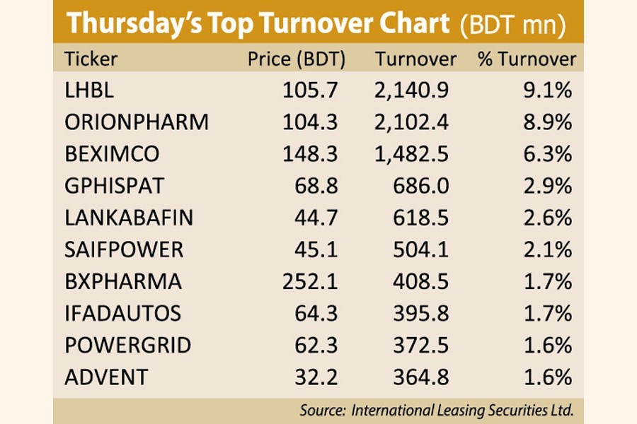 Fortune Shoes topped the scrip wise turnover chart with a value of Tk 957 million followed by Beximco Tk 823 million, IFIC Bank Tk 768 million, Orion Pharma Tk 762 million and NCC Bank Tk 729 million.
