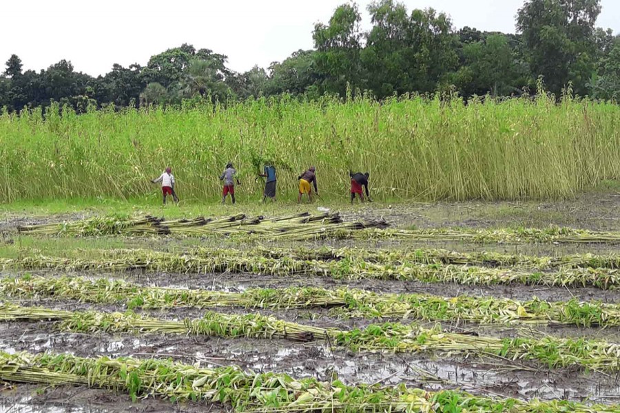 Farmers harvest jute from a land in Gobra village under Gopalganj Sadar on Monday. — FE Photo