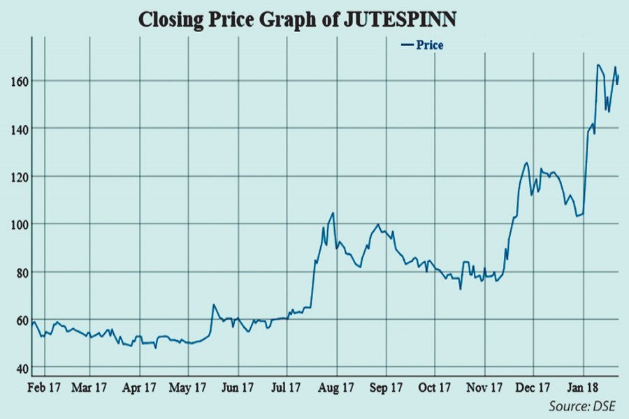 According to DSE information, sponsor-directors hold 39.82 per cent shares of Jute Spinners, while institutions and general shareholders own 23.20 per cent and 36.98 per cent respectively.