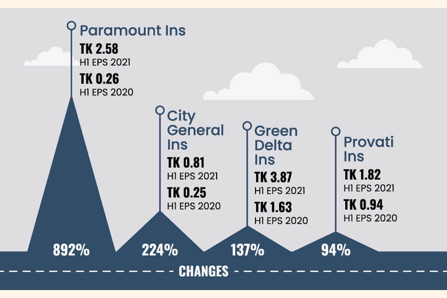 Paramount Insurance's EPS jumped 892 per cent, the highest among the listed general insurance companies, to Tk 2.58 for January-June, 2021, from Tk 0.26 in the same period of the previous year.
