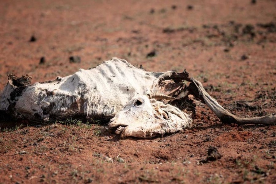 Aerial footage taken nearby showed vast dusty scrubland strewn with cattle carcasses. In Kebele village, people tied ropes beneath the torso of a thin cow to raise it to its feet.