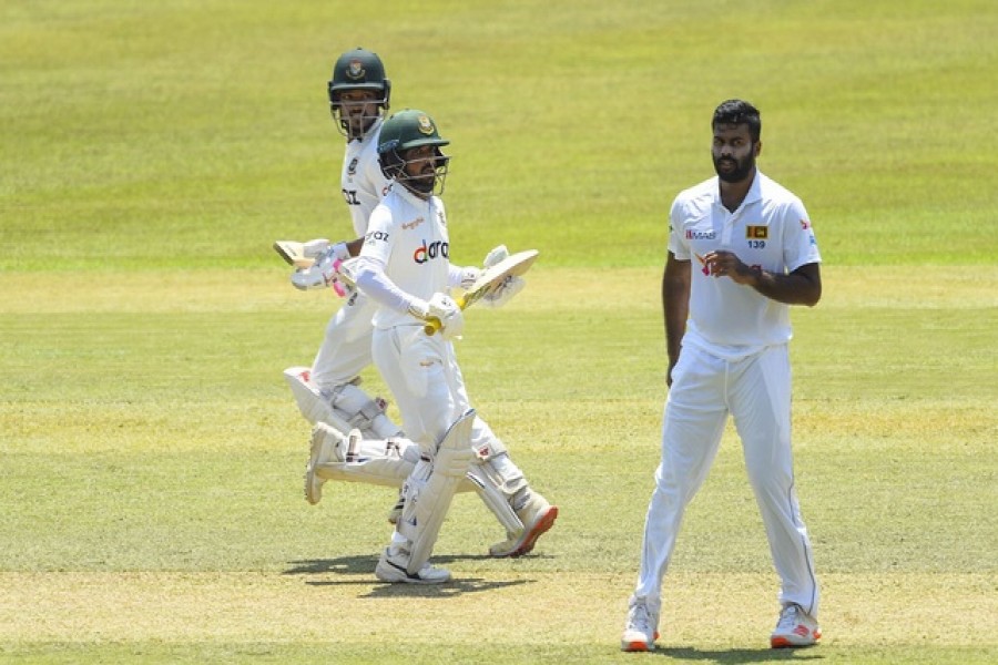 Vishwa Fernando is the only Sri Lankan bowler to have found success, picking up the wickets of Saif and Tamim for 75 runs.