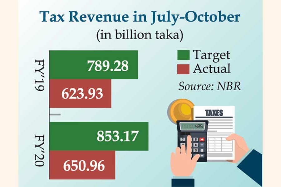 The National Board of Revenue (NBR) collected Tk 650.96 billion in taxes in July-October period of fiscal year (FY) 2019-20 against its target of Tk 853.17 billion, according to NBR provisional data.