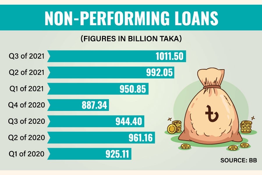 The volume of non-performing loans (NPLs) grew by nearly 14 per cent or Tk 124.16 billion to Tk 1011.50 billion as on September 30, from Tk 887.34 billion as on December 31, 2020, according to the central bank's latest statistics.