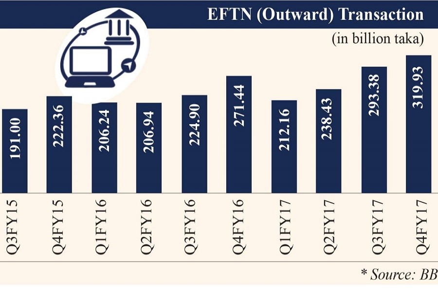 Outward electronic fund transfer or EFTN stood at Tk 1063.92 billion during the past fiscal year (FY17), according to the latest statistics of the central bank.
