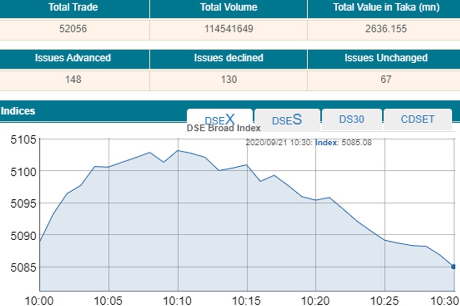 DSEX, the prime index of the DSE, went down by 12.22 points or 0.24 per cent to reach 5,076 points at 10:30am.