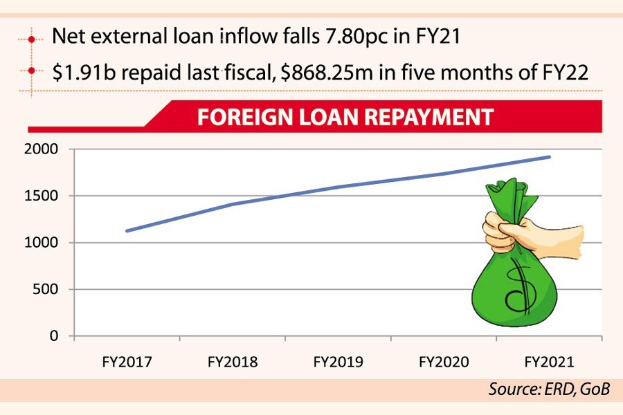 Economic Relations Division (ERD) data show that the net external loan inflow decreased by 7.80 per cent in the last financial year (FY) 2020-21 compared to that of the previous FY2020.