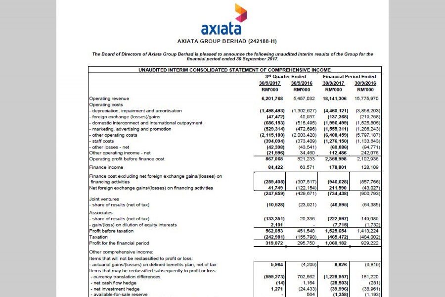 (Conversion rate used, RM 1 = BDT 19.48, as per September 30, 2017)