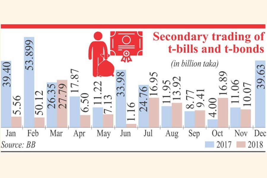 It showed that the value of the secondary trading of treasury bills and treasury bonds fell to Tk 120.40 billion in January-November period of 2018 which was Tk 243.27 billion in the same period of 2017.