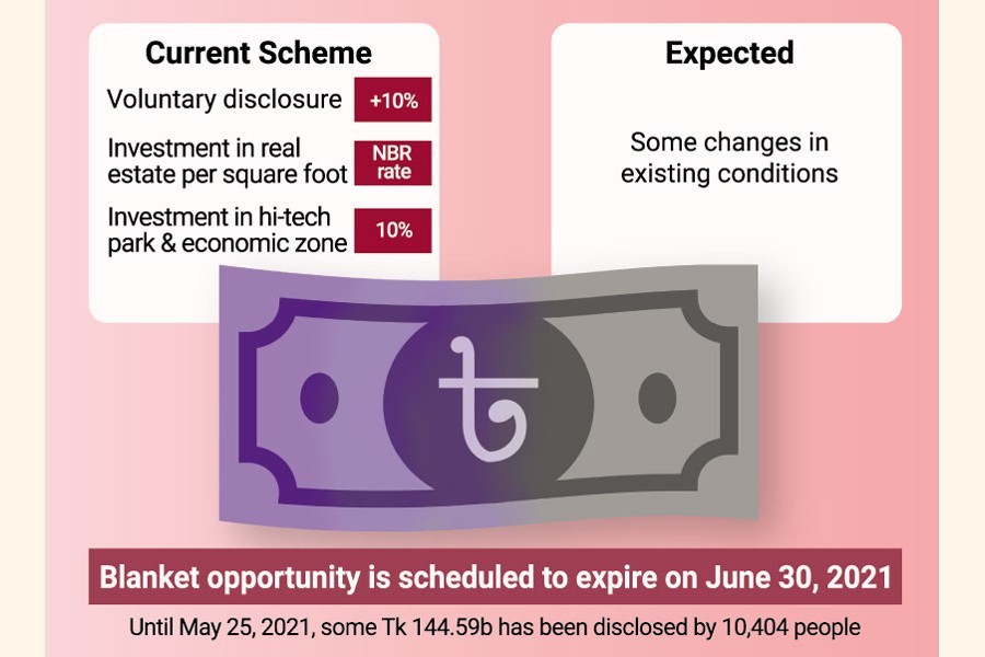They are voluntary disclosure of income by paying 10-per cent tax in addition to normal tax rate, investment in real estate by paying tax at an NBR-prescribed rate based on per-square foot and investment in hi-tech park and economic zones until June 30, 2024, by paying 10-per cent tax.