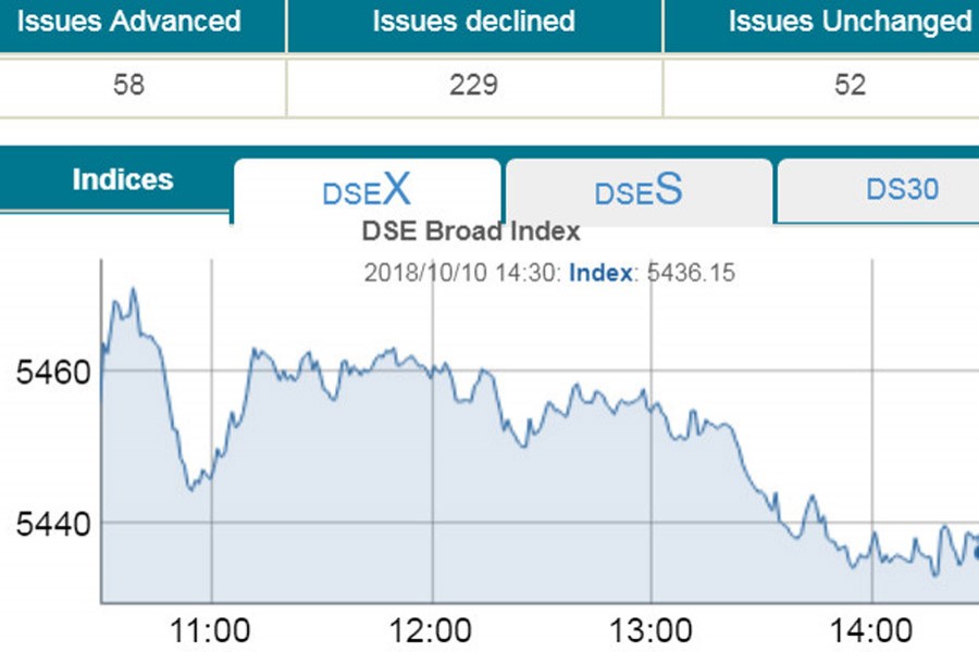 At the end of the session, DSEX, the prime index of the Dhaka Stock Exchange (DSE), settled at 5,436, shedding 19.65 points or 0.36 points after gaining 45 points in the two straight sessions.