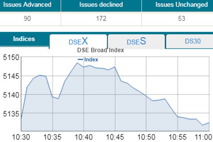 DSEX, the prime index of the DSE, went down by 5.24 points or 0.10 per cent to stand 5,127 points at 11:00am.