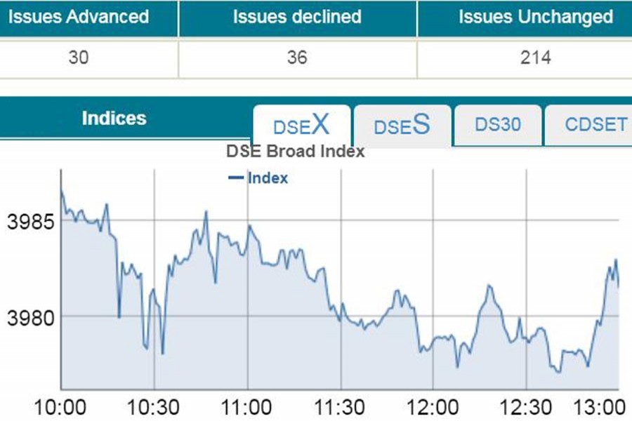 DSEX, the key index of the Dhaka Stock Exchange (DSE), went down by 5.21 points or 0.13 per cent to settle at 3,981.