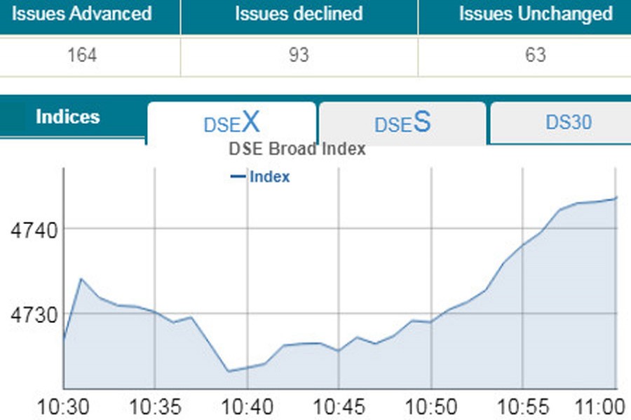 DSEX, the prime index of the DSE, went up by 19.66 points or 0.42 per cent to stand at 4,746 points at 11:00am.