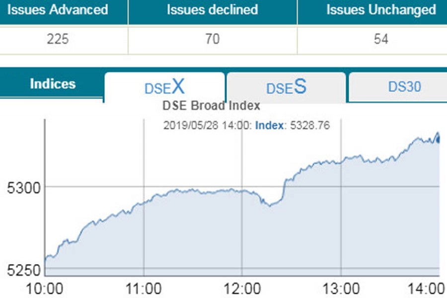 At the end of the session, DSEX, the prime index of the Dhaka Stock Exchange (DSE), crossed the 5300-mark after six sessions and settled at 5328, soaring 75.21 points or 1.43 per cent over the previous day.